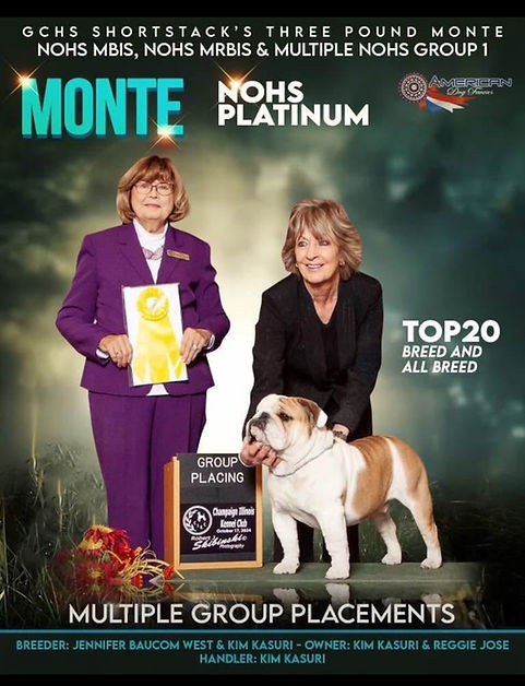 Monte is out of our girl Izzy. He is Bubble's brother and littermate. He is owned and loved by Kim Kasuri and Reggie Jose. They have been on the road showing him since he was a puppy and as you can see he is one of the top Bulldogs in the Nation right now! We are very proud of this boy and all he has accomplished! He is the epitome of what an English Bulldog should be and we just love him!